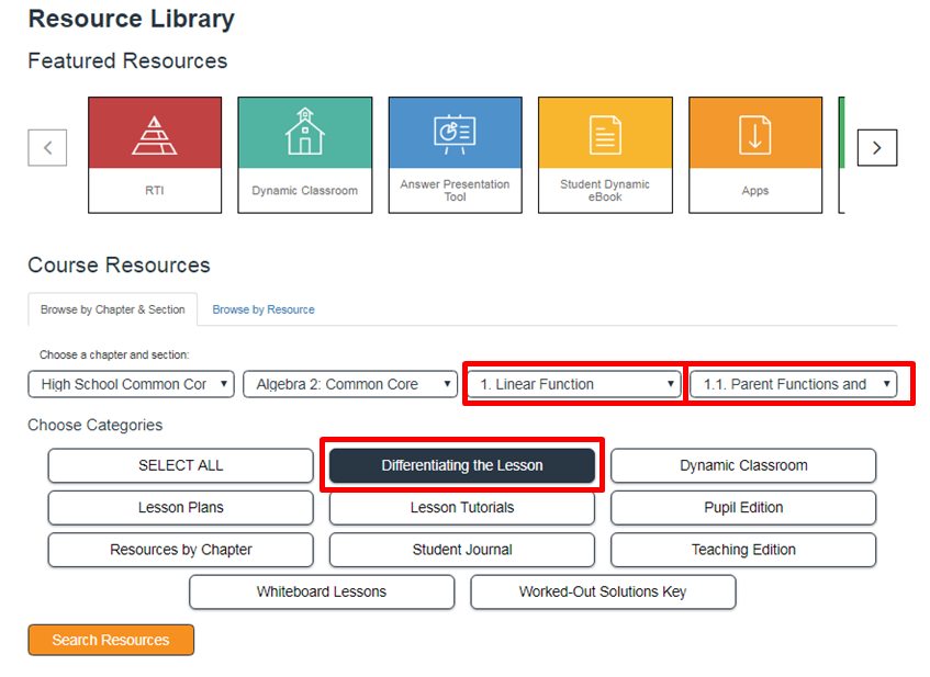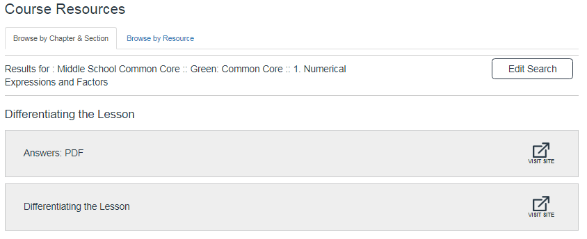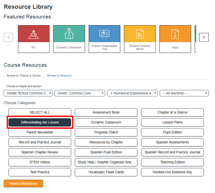 Differentiating the Lesson can be found in the online teacher Course Resources. In middle school, it can be found by searching chapter level resources. In high school, the worksheets can be found by searching the Course Resources at the chapter or section level.
