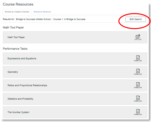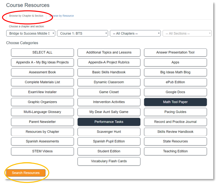 There are two ways to search for resources. The first way is to Browse by Chapter & Section. This will allow a teacher to choose a Big Ideas Math program from the first drop-down, and a book, chapter and section to narrow the search. Select one or more of the available categories from the resource options and click Search Resources.