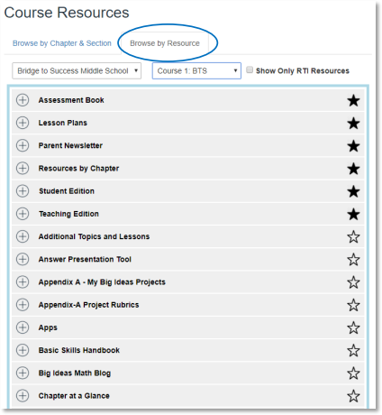 This method will allow teachers to choose a resource from a course and find what is available for that resource in a specific chapter or section. Teachers may also mark favorite resources with a star so they appear at the top of the list.