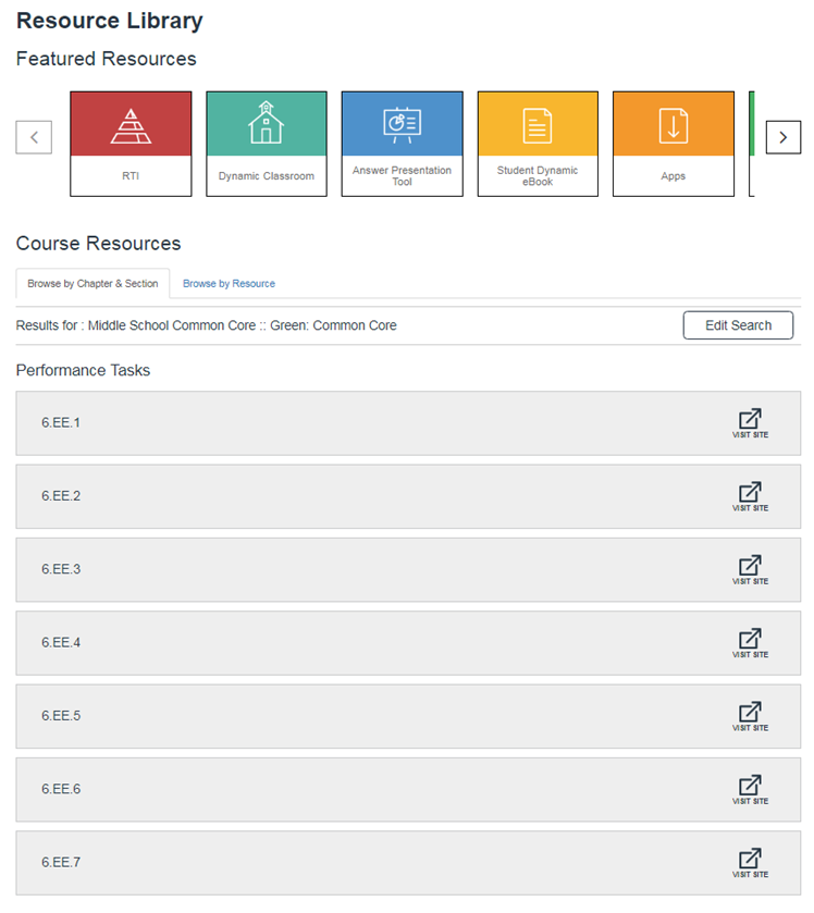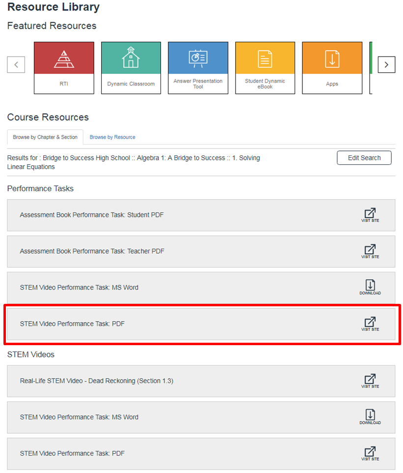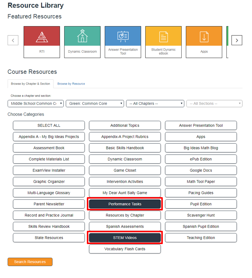 The middle school Performance Tasks can be found by standard and by chapter. Teachers can find the Standard Performance Tasks by searching the Course Resources. The Chapter Performance Tasks can be found by searching the Chapter Resources for the STEM Videos, as these Performance Tasks correlate to each chapter's STEM Video.