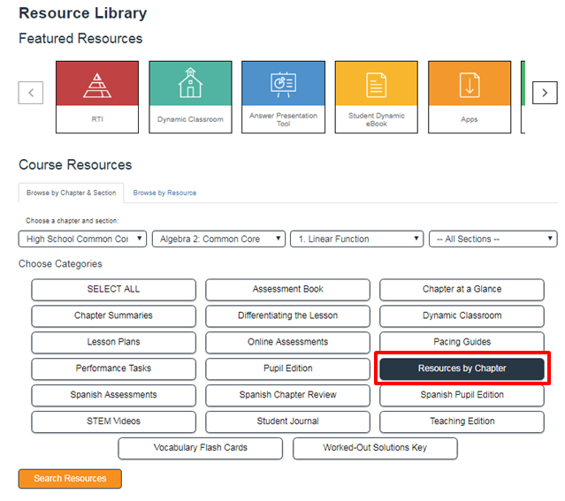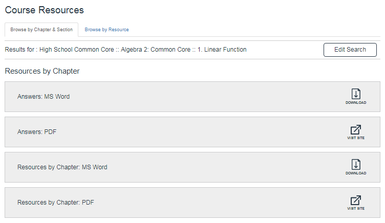 The Resources by Chapter is available in print and can be found in the online teacher Course Resources at the chapter and section levels. The Resources by Chapter are available in PDF and Microsoft Word.