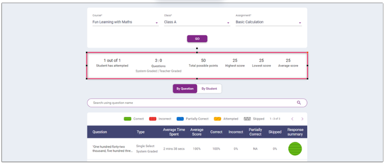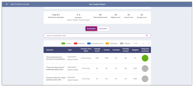 - Visual representation of the correct, incorrect, partially correct and skipped percentages for each question.