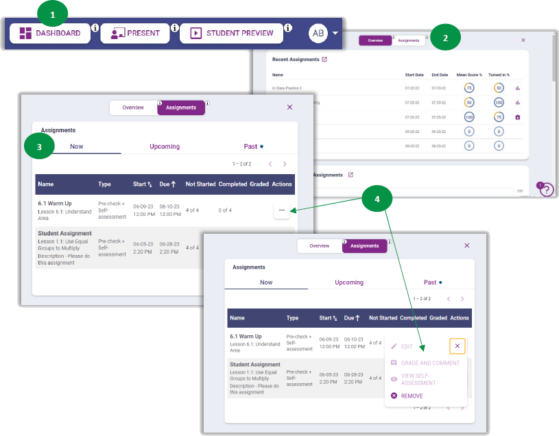 - Select the three dots on any assignment to edit or grade the assignment, as well as provide feedback to students, view student self-assessment data, or remove (delete) the assignment.